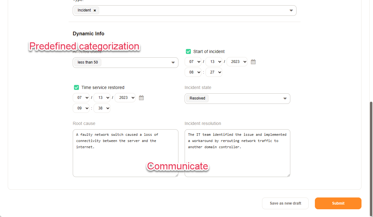 • Conduct a post-incident review to evaluate the incident management process and identify areas for improvement. After solving an issue, depending on it's impact, you can schedule a post-incident review for the team involved.