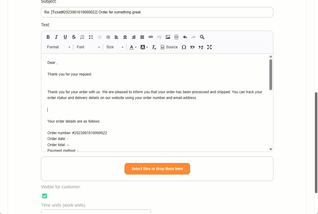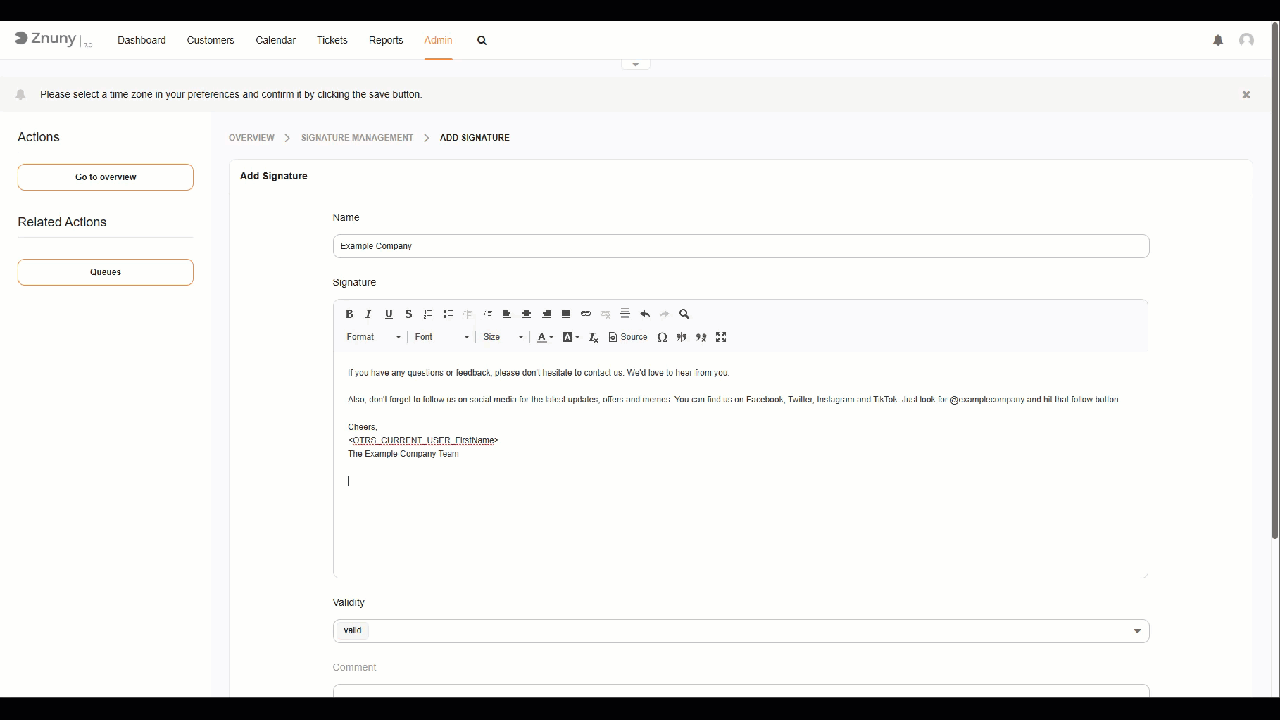 Add a default signature to each queue, providing your team with the up-to-date signature in every template. Add logos per drag and drop directly into the signature.